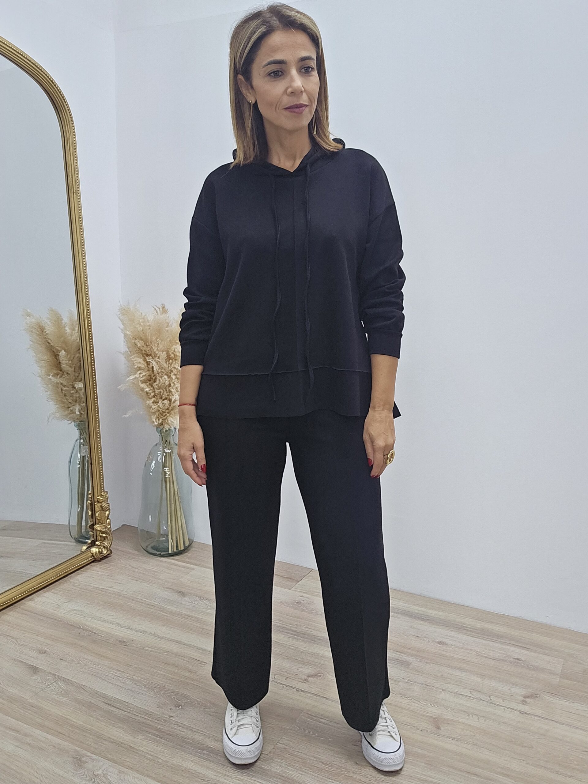 Sudadera con sin goma en la cintura y capucha – pantalón camal ancho.